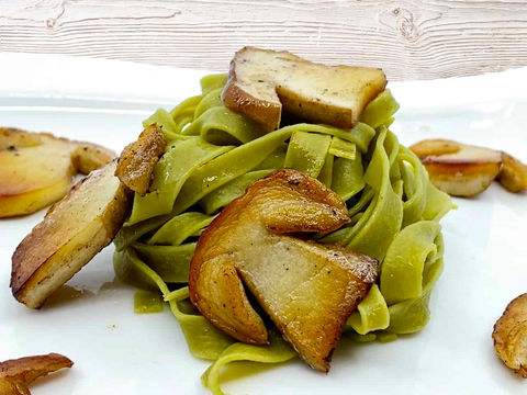 Mit Steinpilzen: Steinpilze in ca. 4 mm breite Scheiben schneiden, im Olivenöl/Butter anbraten und über die Tagliatelle verteilen.